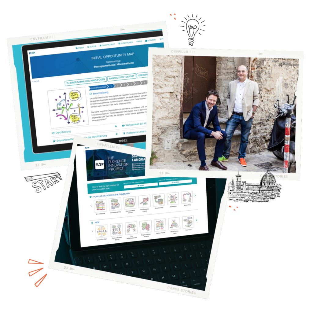 An einem Donnerstagabend in Florenz im März 2016 entstand dann die Idee: „Wir erweitern unsere Sammlung und katalogisieren sie, um jederzeit und überall alle Innovationsmethoden parat zu haben.“ – das Florence Innovation Project war geboren, kurz FLIP – die erste Version des heutigen Innovation Wiki.